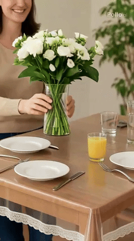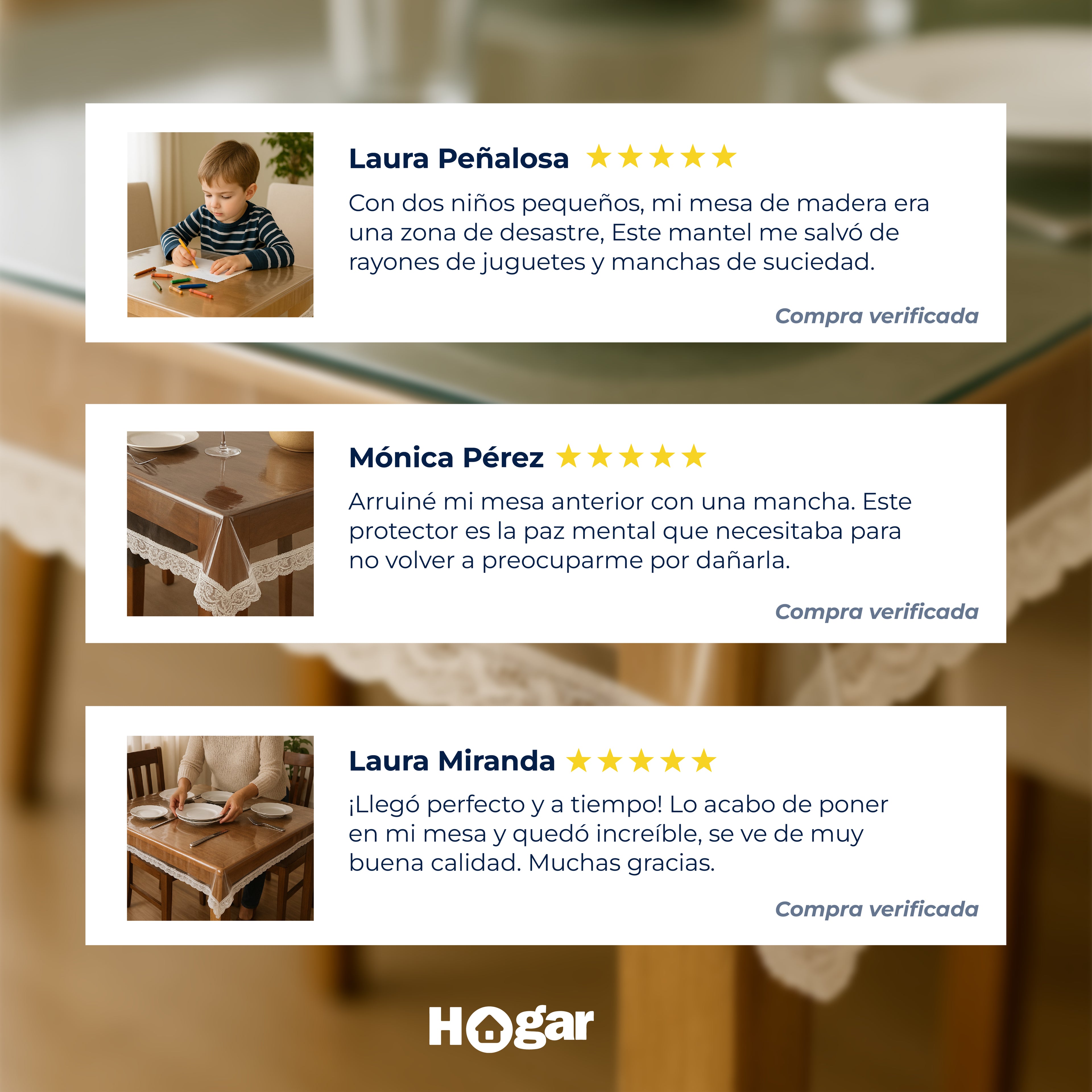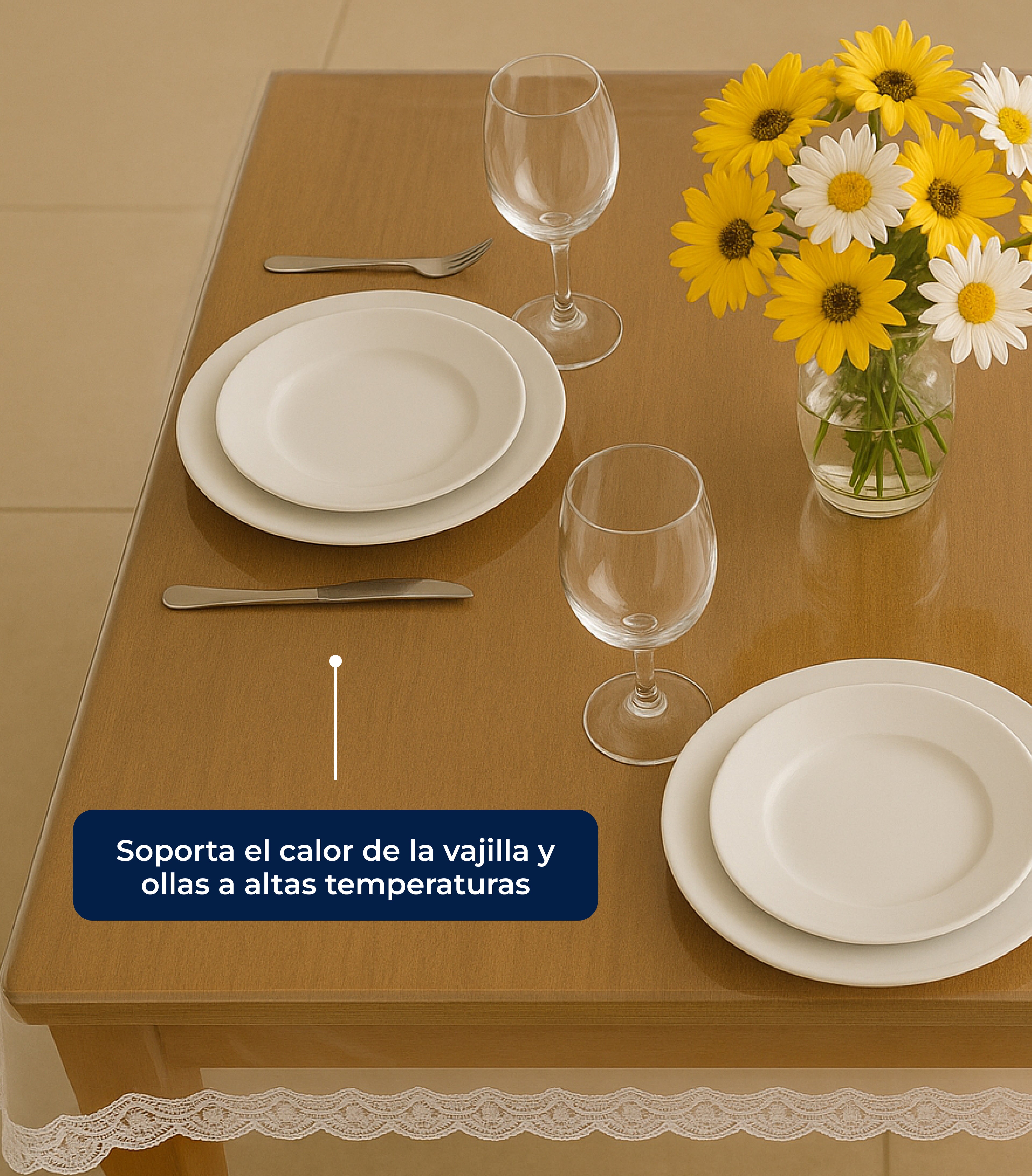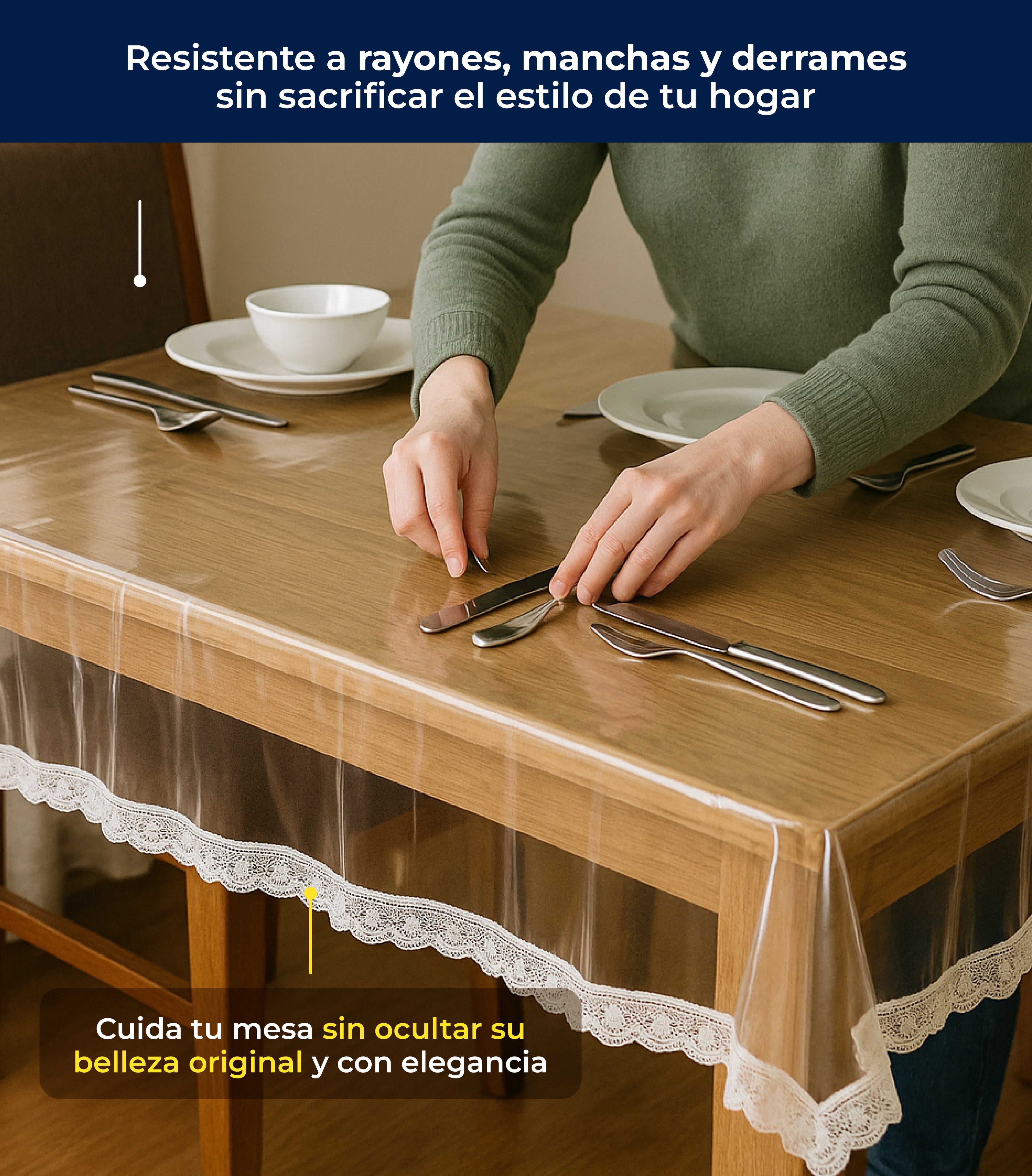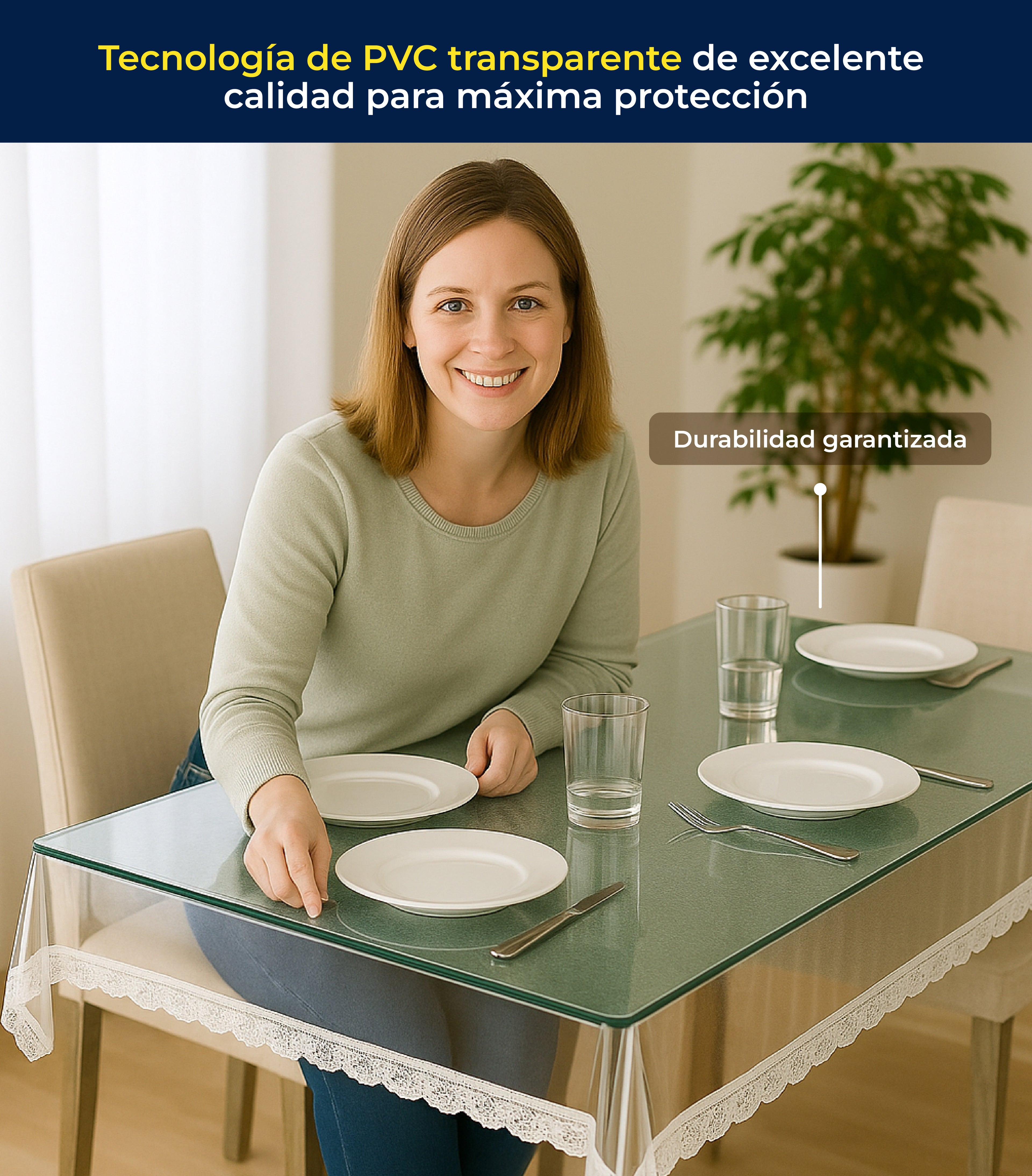Nuestro Mantel Transparente con Bordado Europeo de PVC se adapta a cualquier superficie, dándote paz al momento de poner objetos sobre él.